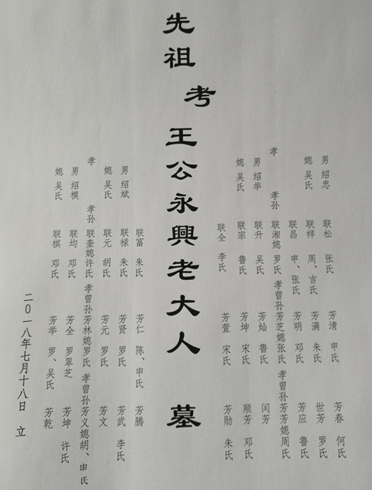 公元2018年7月18日岁次戊戌年六月初六,修缮我祖大晏公等四代八祖祖墓告竣之良时,懋公支系家族老幼族亲集聚并肃立于大晏祖等祖墓之前,告以文曰: